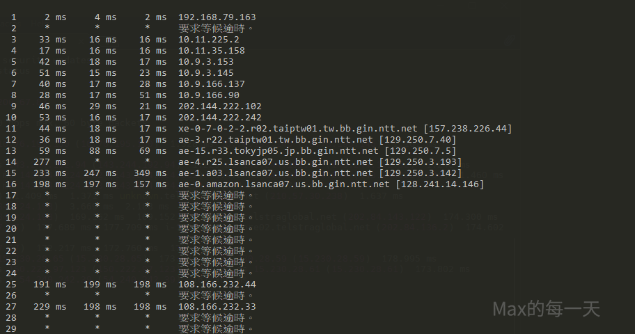 在網路的世界裡, 有一個叫 traceroute 指令, 在 window 裡是下 tracert, 透過這個指令可以知道你目前的網路情況下, 連到伺服器中間經過了那些主機幫你接力的傳送網路封包, 以在台灣地區, 使用台灣之星的網路, 執行畫面如下: