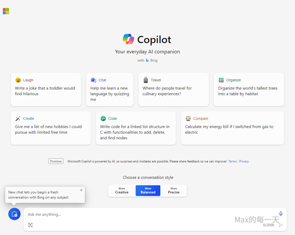 Copilot 用起來跟chatGPT 很像, 有一個可以對話的輸入框.