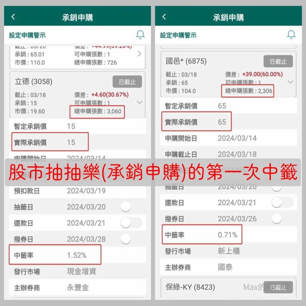以左圖,立德(3058) 來說, 先預付15,000元, 萬一有中獎後賣掉大約可以賺到 4,600 元。申購截止後可以看到中籤率, 以國邑(6875) 來說, 雖然中獎率只有立德的一半, 但如果中獎可以拿到 39,000元, 超賺的, 而且千分之七, 機率感覺滿高的。