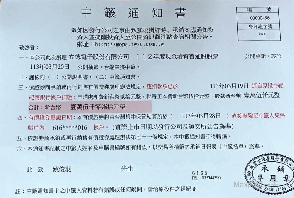 入社會這麼多年, 第一次中籤, 抽抽樂(承銷申購) 的規則很簡單, 要先花台幣$20 才有抽籤資格, 接著要預先扣繳「承銷價」x 1000 的股票錢, 由於是一個帳戶一抽, 所以總申購張數愈高, 中獎機率愈高。