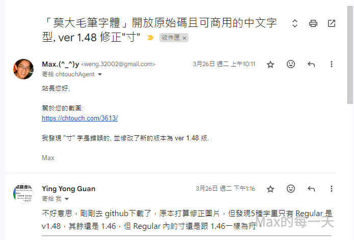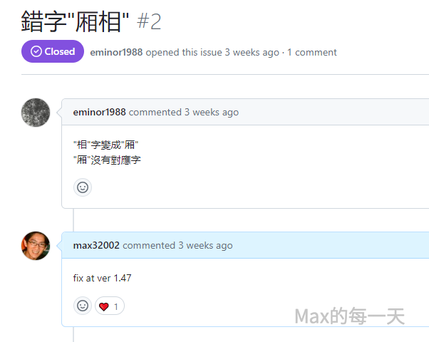 隨手調整一下, 就改好了, 就上傳到github 上, 然後我把這個字型名字打到 google 裡去查, 看看中文世界裡有什麼樣子的討論與分享, 結果我看到有好心人的分享, 看完之後發現, 新的錯誤, 也是很快就修正好, 然後去通知網站的站長: