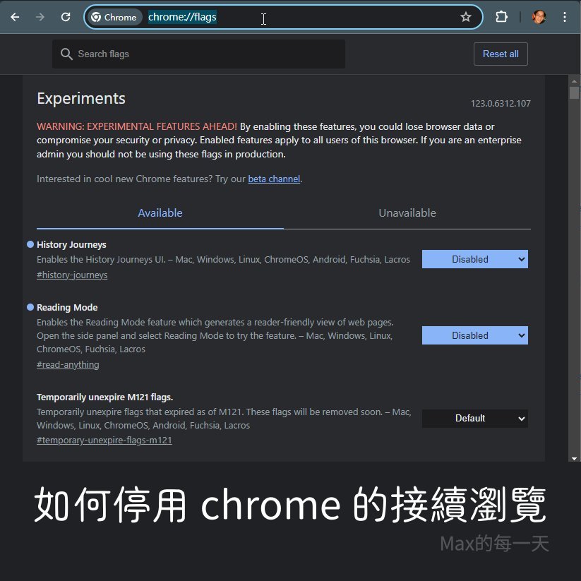 更新:目前 chrome 128.x 以後的版本, 都還沒找到可以關閉 resume browsing 的方法。