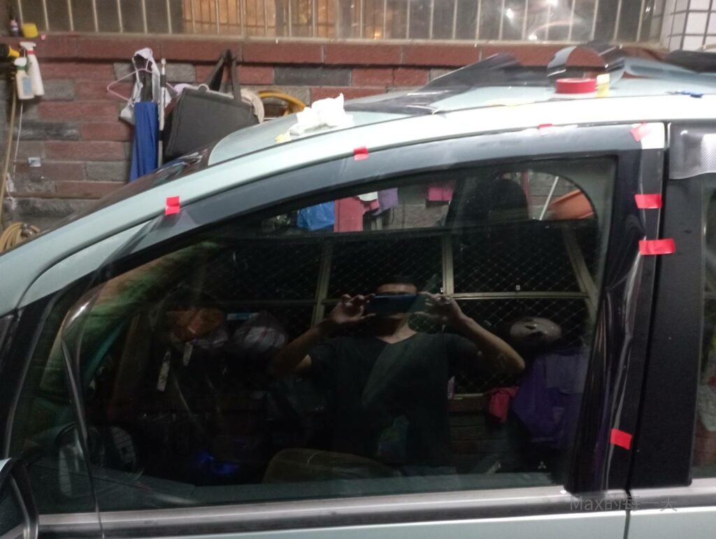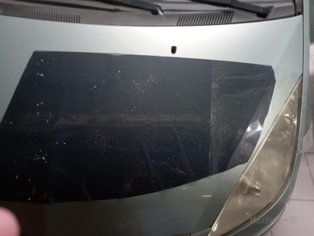 在拿掉透明膜之後,硬去刮下圖的空氣的隔熱紙,有可能會讓隔熱紙產生摺痕,超級醜。於是我就重貼,建議如果是第一次挑戰自己貼,在買隔熱紙時最好多買一些,要預留失敗的可能。