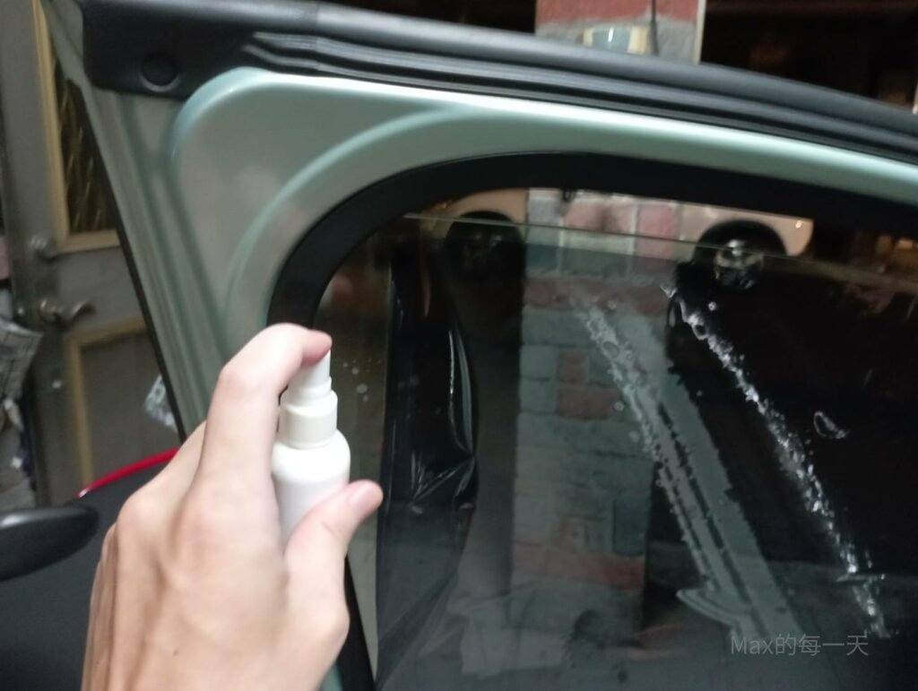 第二次割好隔熱紙,我就直接把透明膜撕掉,並先把玻璃片與隔熱紙會黏的那一面噴上泡泡水。