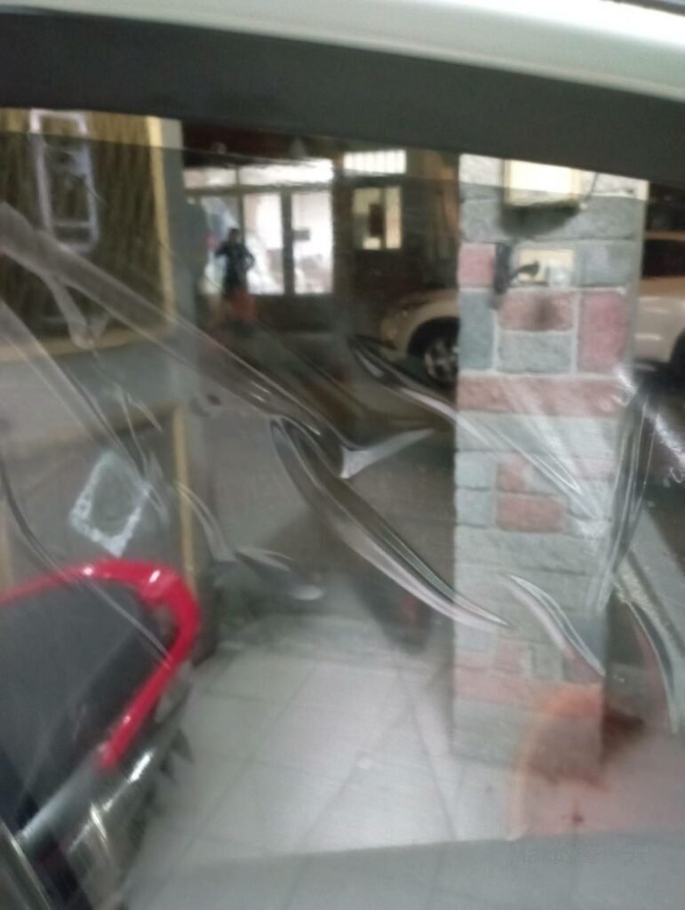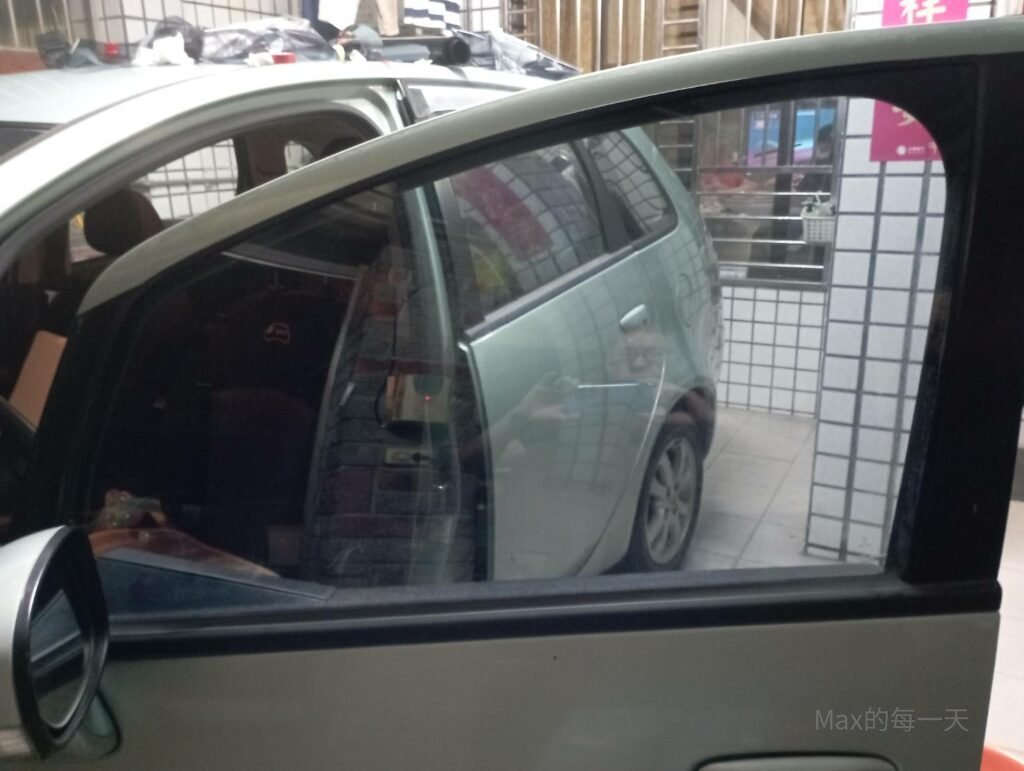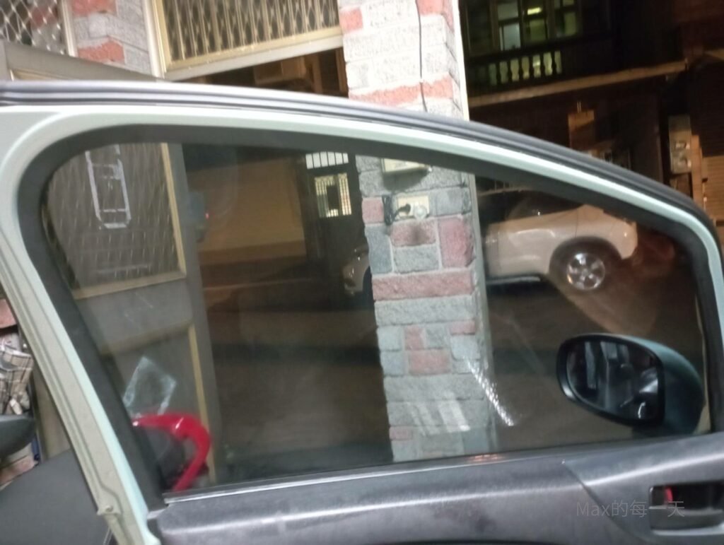 這時候就會發現,玻璃其實不像隔熱紙一樣的平,有小小的彎曲,這個聽說可以用熱手機或吹風機去加熱隔熱紙,讓隔熱紙微微的一起彎曲變形。