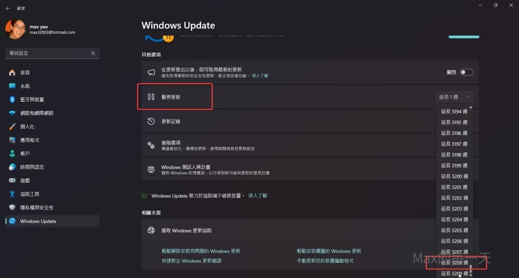 要停用 Windows Update, 網路上之前有教學是設定在『暫停更新』的項目中,點開『選取日期』的下拉式選單,往下選擇最後一個日期(100年後), 如下圖所示: