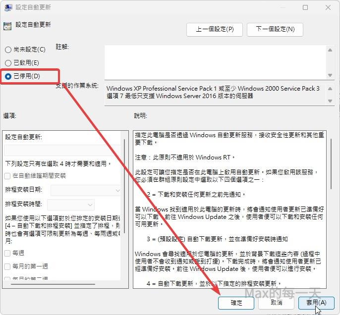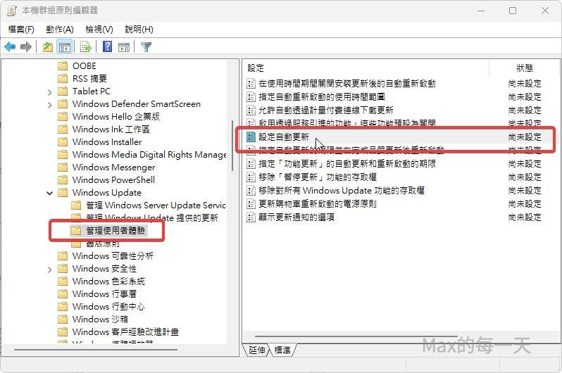 電腦設定 > 系統管理範本 > Windows 元件 > Windows Update > 管理使用者體驗 > 設定自動更新