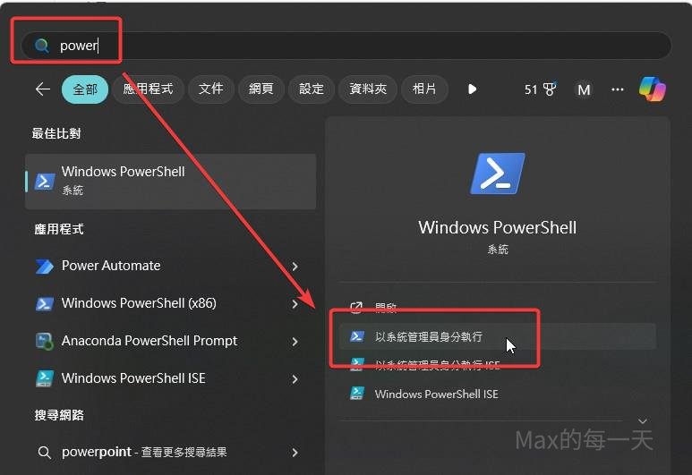按 Win 鍵, 輸入 Power, 點選右側的『以系統管理員身份執行』, 如果直執開啟只有使用者權限, 接下來的指令會失敗。