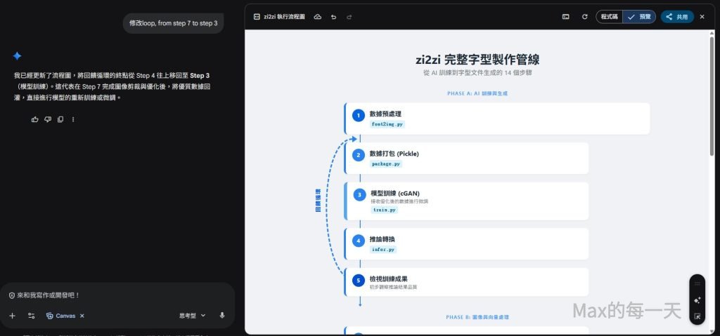 最近我嘗試用 Gemini 的 Canva 模式畫流程圖。我原本想畫一個閉環,預計讓步驟 5 回到步驟 2。結果 Gemini 陷入鬼打牆,不斷宣稱已經修改完成,畫面卻始終不對。最後我換了個方式,改請它畫步驟 7 回到步驟 4,沒想到呈現出來的結果,正好就是我預期的步驟 5 到步驟 2。面對 AI 工具,有時候繞路走反而才是捷徑。