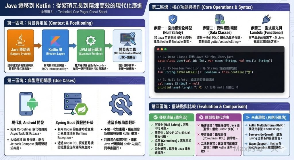 Kotlin 設計之初就考慮了與 Java 的協同工作,允許開發者在一個專案中同時使用 Kotlin 和 Java,讓從 Java 遷移到 Kotlin 的過程非常平滑。
