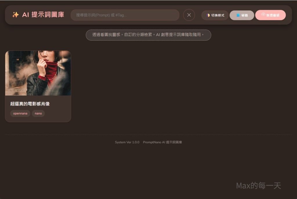 不同於冷冰冰的文字表格,PromptNano 讓你透過「看圖」的方式直覺管理靈感。搭配溫暖可愛的 UI 設計,支援深色/淺色主題切換,讓整理提示詞變成一件療癒的事。