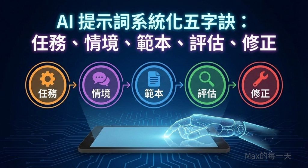 既然要系統化思考,你可以直接套用五字訣。這套邏輯可以把任何需求轉成有效的指令。這五個核心分別是:任務、情境、範本、評估、修正。與其給模糊的指令,不如直接把這套架構寫清楚。