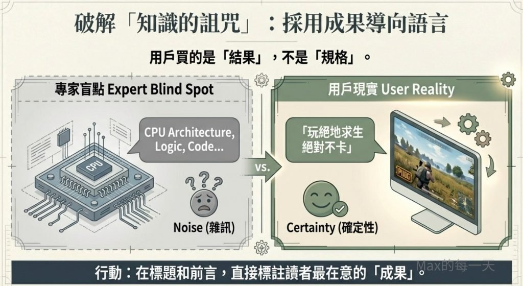 - 忽視用戶感知的成果: 客戶付費是為了「不需要學習這些知識」就能解決問題。如果專業技術無法轉化為「玩遊戲絕對不卡」這類直觀的成果導向語言,高品質就無法產生購買慾望。