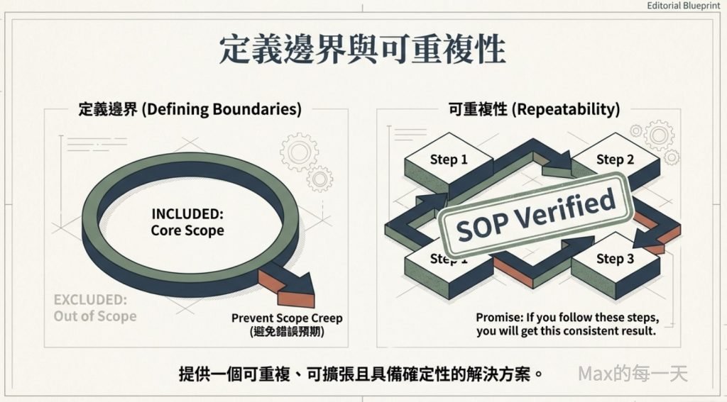 此外,明確「定義邊界」也同樣重要。在文章開頭就清楚告訴讀者「包含什麼」與「不包含什麼」,能有效管理讀者預期,避免範疇潛變(Scope Creep),更能凸顯你所提供解決方案的專業性與專注度。