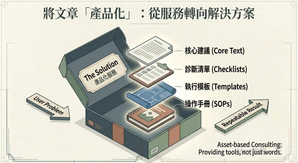 這意味著你的產出不應只有文字。你可以採取「綑綁建議(Bundle Advice)」的策略,在核心內容之外,提供讀者可以直接取用的補充資產,例如「診斷清單、執行模板或操作手冊」。這種模式類似於「資產型顧問服務(Asset-based Consulting)」,能幫助讀者將文章中的知識,轉化為實際的行動與成果。