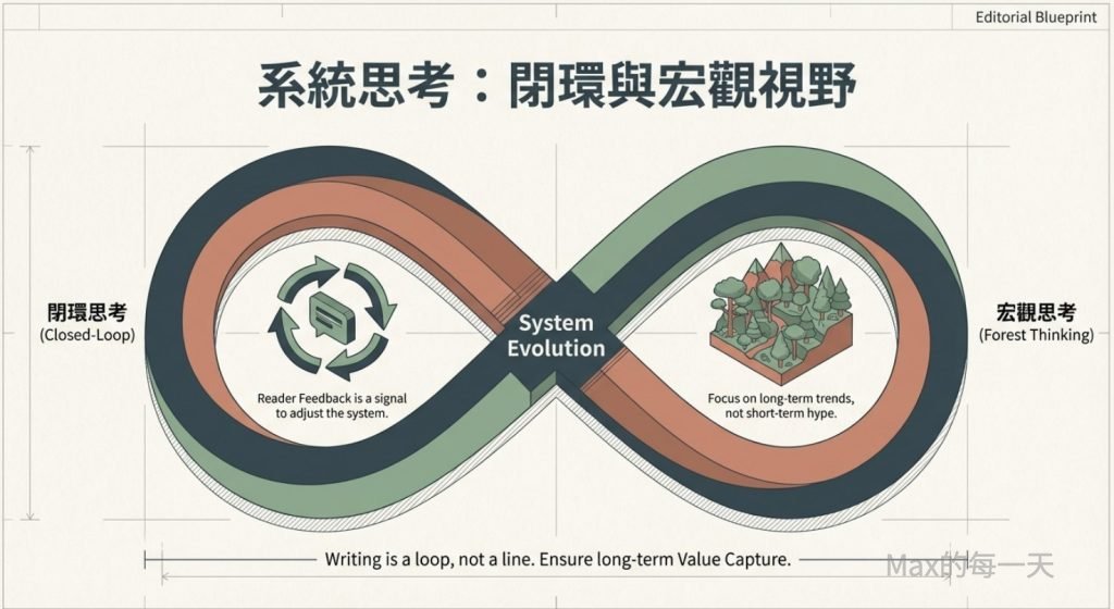首先是「閉環思考(Closed-loop Thinking)」。積極收集讀者的回饋與數據。如果許多讀者反映文章的某個部分看不懂,這不是讀者的問題,而是你的文章這個「系統」需要優化的信號。透過持續的修改與調整,讓你的內容產品越來越貼近用戶需求。