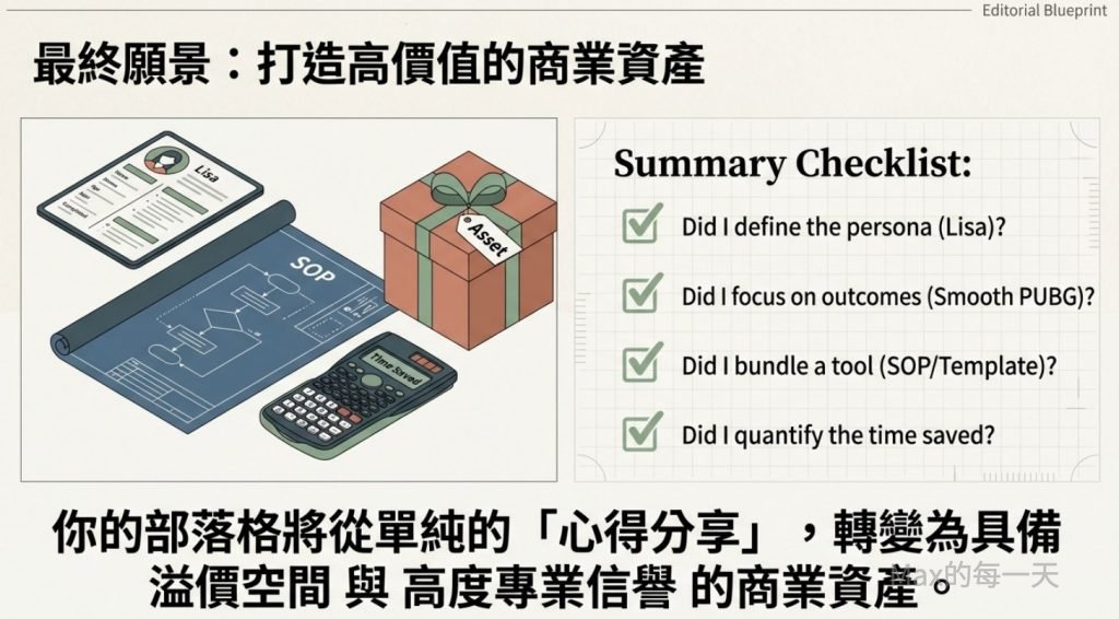 總結來說,將部落格寫作從「心得分享」轉變為打造能解決特定問題的「工具包」,是一種思維上的根本轉變。你不再只是一位作家,更像是一位「內容產品經理」。作為產品經理,你必須先定義你的用戶(那個「Lisa」),接著用他們的語言闡述價值主張(「不卡頓的遊戲體驗」),然後打造一個完整的解決方案(「工具包」),衡量其影響力(為用戶「省下10小時」),最後根據反饋持續迭代(一個「持續演進的系統」)。