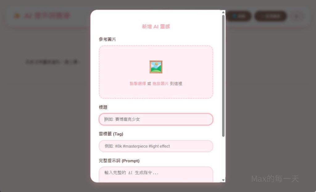 • 新增靈感:點擊「+ 新增靈感」,可拖拉圖片上傳並填寫 Prompt。