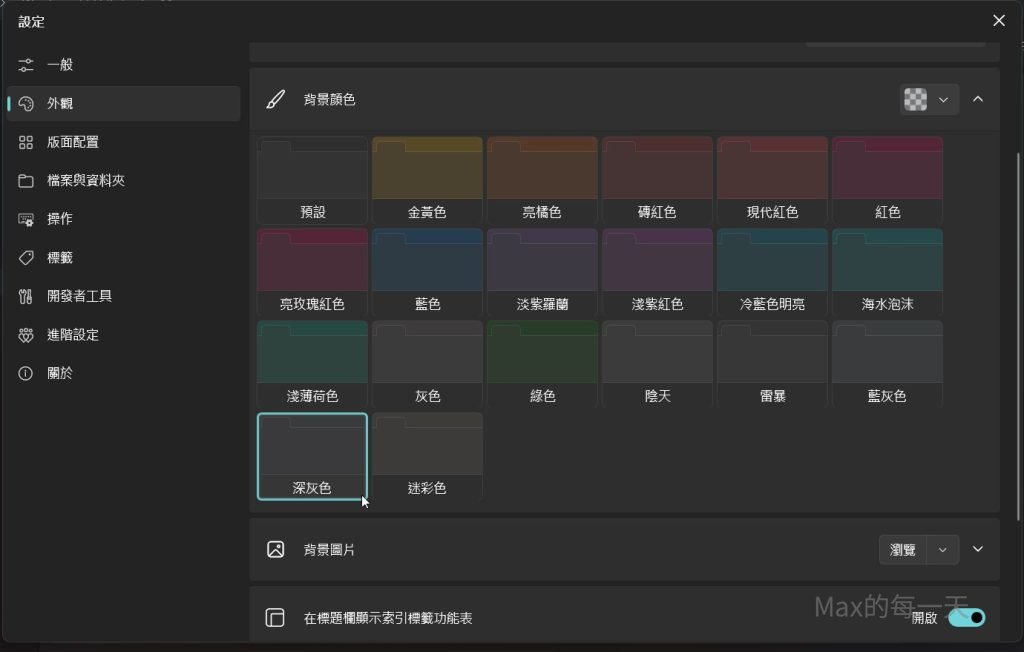在應用程式主題區段,你可以手動切換深色或淺色模式,也可以讓它跟隨 Windows 系統的設定。下方有一個佈景主題下拉選單,裡面提供多種預先配置好的配色方案,你可以直接套用喜歡的色彩。