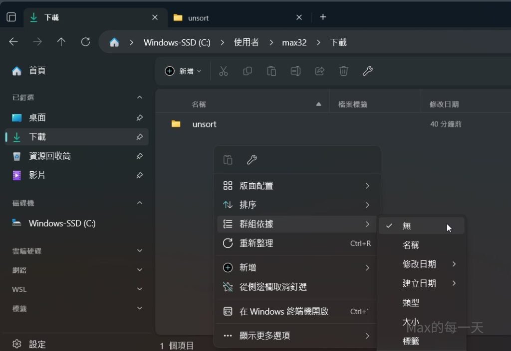 使用 Files 的預設值去開啟「下載」資料夾時, 我其實很不習慣使用有「群組功能」的清單, 讓我感覺畫面反而更零亂, 可以在空白處按右鍵, 選「群組依據」, 再選無, 就可以關閉群組。