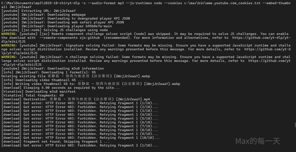 在使用 yt-dlp 下載 youtube 影片為 mp3 時出現錯訊息, 這時候即使把瀏覽器的 cookie 儲存為 .txt 檔餵給 yt-dlp 一樣顯示無法下載.