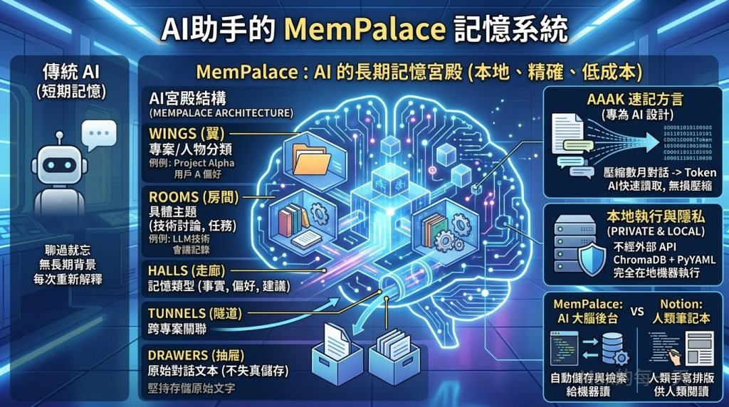 你有沒有發現,現在的 AI 雖然聰明,但往往聊過就忘?就像一個只有「短期記憶」的同事,每次對話都要重新解釋背景。今天要介紹的 MemPalace 就是為了幫 AI 裝上「長期記憶」而生的開源系統,讓你的 AI 助手能真正記住你的習慣與過去。