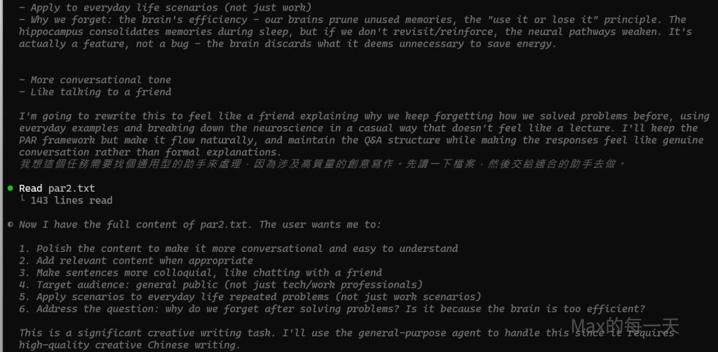 - Address the question: why do we forget after solving problems? Is it because the brain is too efficient? This is a significant creative writing task. I’ll use the general-purpose agent to handle this since it requires