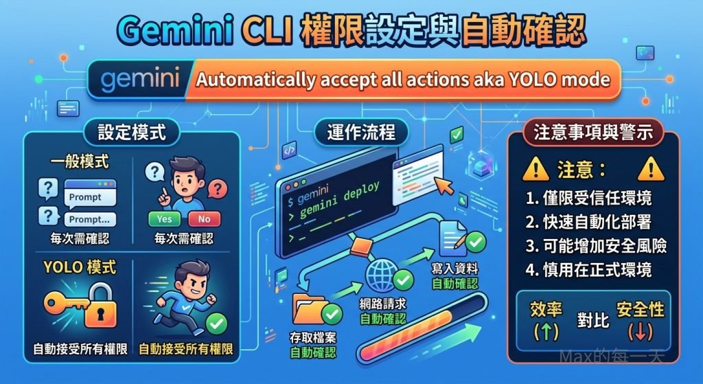 如果你跟我一樣,希望它直接把事情做完,不要再跳視窗問我,最簡單的方法就是在啟動時加入參數。在 Gemini CLI 裡有一個很直覺的設定叫做 YOLO 模式(意思就是「人生只有一次,直接衝吧!」),只要加上 –yolo 或設定相關參數,它就會變得很乖。