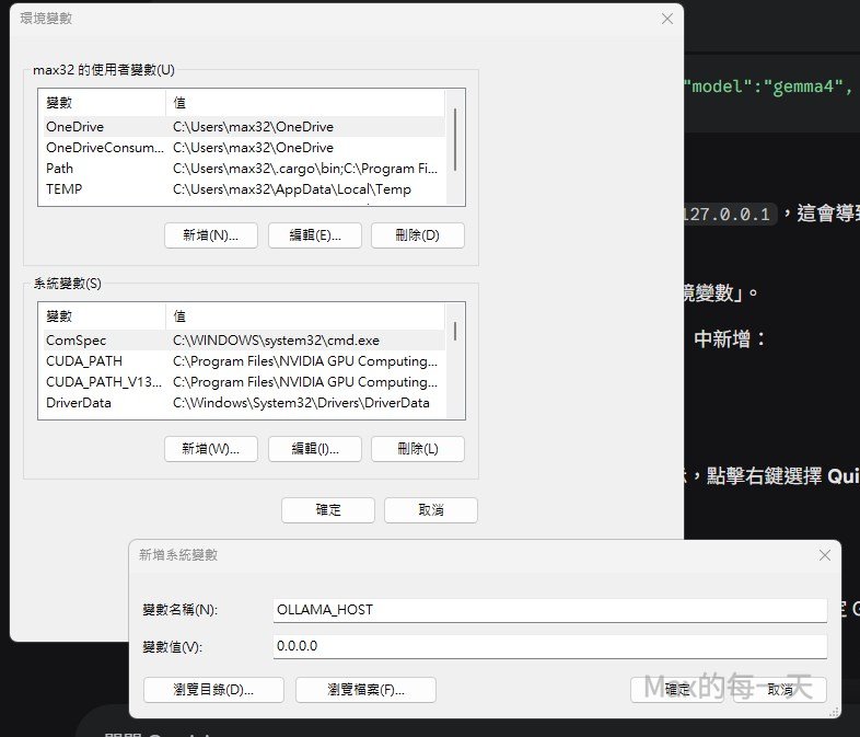 從你的設定來看,OLLAMA_HOST=0.0.0.0 已經正確生效,且 ping 也能通,代表網路層是對的。連線失敗通常是因為 Windows 版 Ollama 雖然設定了環境變數,但服務本身沒有完全「重啟」以套用新設定,或是被防火牆擋住。