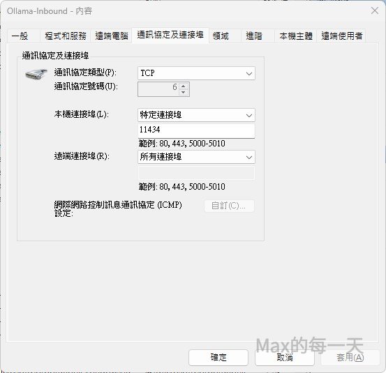 11434。 - 選擇「允許連線」,並確保「網域、專用、公用」三個選項都勾選。