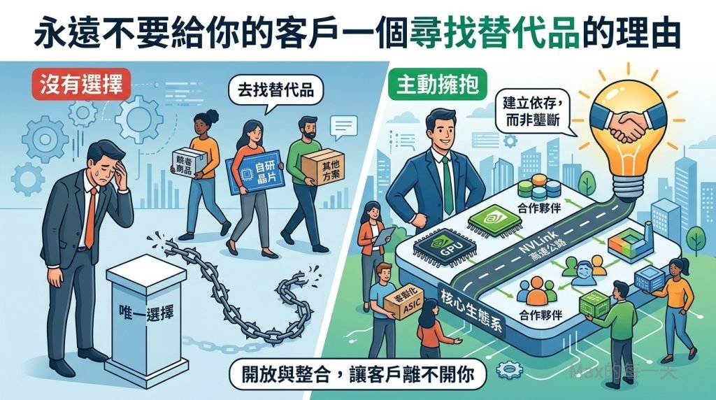 黃仁勳看透了人性:與其讓客戶因為被壟斷感到痛苦而拼命尋找替代品,不如把門打開,讓你的替代品也跑在我的路上。