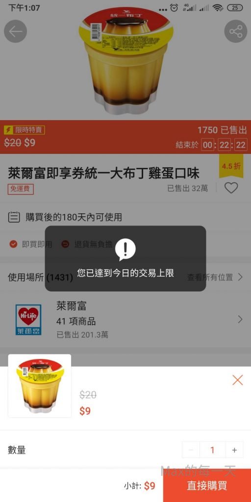- 部份商品有每日購買上限,雖然下一個時段裡還沒購買,會顯示錯誤訊息:「您已達到今日的交易上限」。
