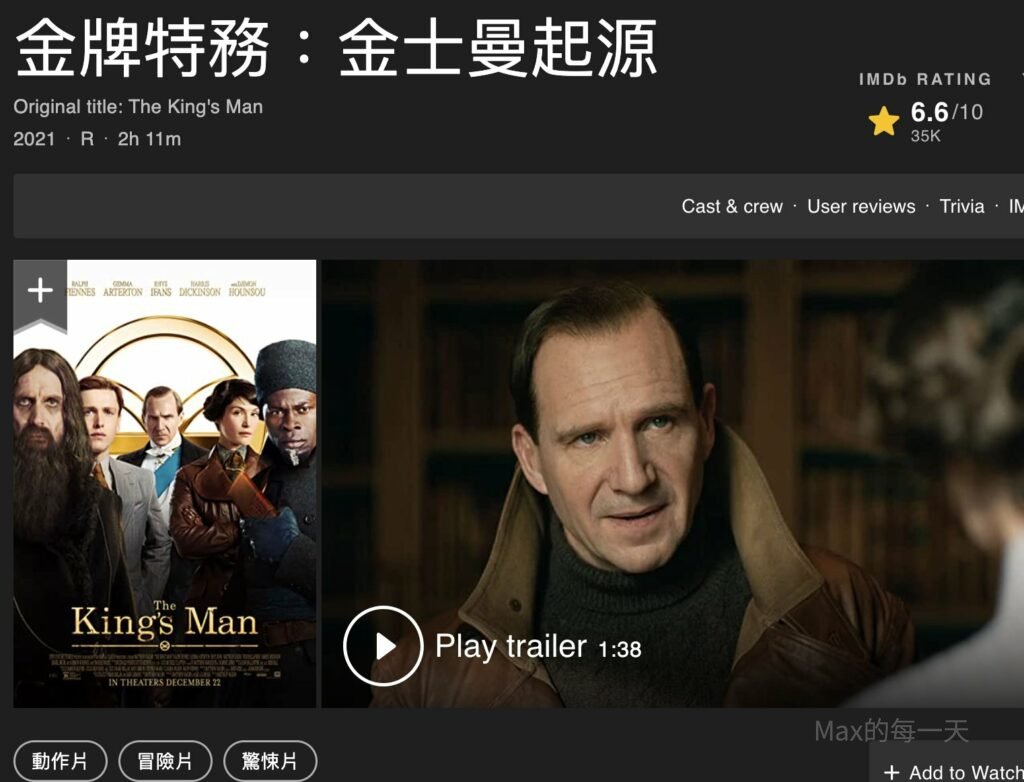 ◎譯 名 王牌特工:源起/王牌特工前傳/皇家特工:第一任務(港)/金牌特務:金士曼起源(台) ◎片 名 The King's Man ◎年 代 2021 ◎國 家 英國/美國 ◎類 別 動作/冒險/喜劇 ◎語 言 英語 ◎字 幕 中文字幕 ◎IMDb評分 6.7/10 from 21,015 users ◎IMDb鏈接 https://www.imdb.com/title/tt6856242/ ◎視頻尺寸 1920 x 800 ◎片 長 130 Mins ◎導 演 馬修·沃恩 Matthew Vaughn ◎主 演 拉爾夫·費因斯 Ralph Fiennes 哈里斯·迪金森 Harris Dickinson 瑞斯·伊凡斯 Rhys Ifans 傑曼·翰蘇 Djimon Hounsou 傑瑪·阿特登 Gemma Arterton 馬修·古迪 Matthew Goode 丹尼爾·布魯赫 Daniel Bruhl Shaun McKee Peter York Charles Dance Alexandra Maria Lara Alexander Shaw Bevan Viljoen Shaun Scott Andrew Bridgmont Valerie Pachner