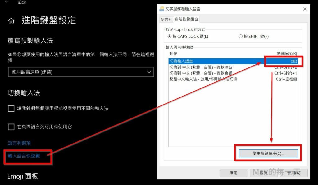 輸入語言快速鍵 – 切換輸入語言 – 變更按鍵順序