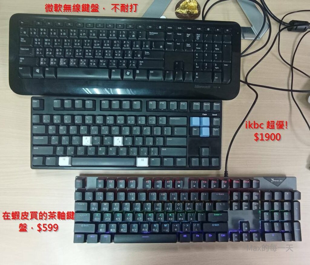 一開始覺得機械鍵盤很酷炫,一但用機械鍵盤之後,就得了一種無法使用傳統鍵盤的病,也不是完全無法使用傳統的鍵盤,我有一個微軟的無線鍵盤滑鼠組合,最近早上在使用這個傳統鍵盤,可能是手指的精力旺盛,所以覺得用起來沒差,但是,到下午,可能是體能下降,指力變弱,就會覺得我的傳統鍵盤的按鍵好沈重! 使用起來好吃力,這個體驗自從使用過機械式鍵盤就沒遇到過. 真心建議人人都多把機械鍵盤,在家用青軸,在辦公室用紅軸或茶軸,比較安靜。