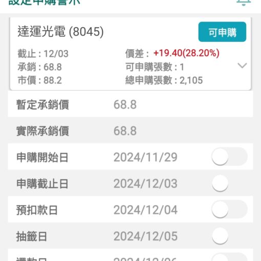 網通設備廠達運光電將在2024-12-11日掛牌上市,上市前辦理現金增資發行新股,承銷價為68.8元,預計承銷2,105張,申購期間為11月29日至12月3日,抽籤日為1 […]