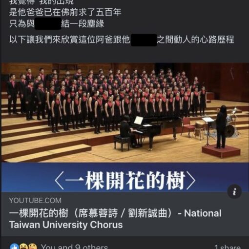 今天看到一個高職女同學的貼文,主要是在講把小孩送去上學,順便講與小孩爸爸結一段塵緣。 我仔細欣賞了合唱團唱的歌,傳送門:https://www.youtube.com/w […]