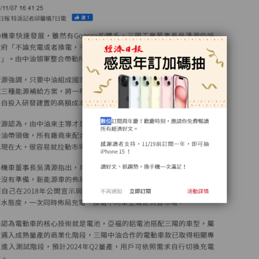 連到經濟日報的網頁,往下捲動頁面觸發彈出式廣告: 數位訂閱周年慶!歡慶時刻,邀請你免費暢讀所有經濟好文。感謝讀者支持,11/19前訂閱一年,即可抽 iPhone 15 ! […]